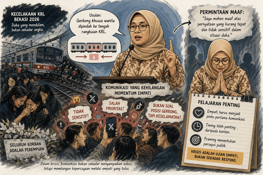 Peristiwa kecelakaan kereta di Bekasi yang dikenal sebagai Kecelakaan Kereta Bekasi 2026 bukan hanya meninggalkan luka mendalam bagi korban dan keluarga, tetapi juga membuka ruang evaluasi serius terhadap cara pejabat publik berkomunikasi di tengah krisis. Dalam situasi yang sarat emosi tersebut, pernyataan dari Arifah Fauzi mengenai usulan pemindahan gerbong khusus wanita ke tengah rangkaian KRL justru memicu kontroversi publik.
